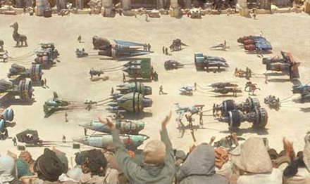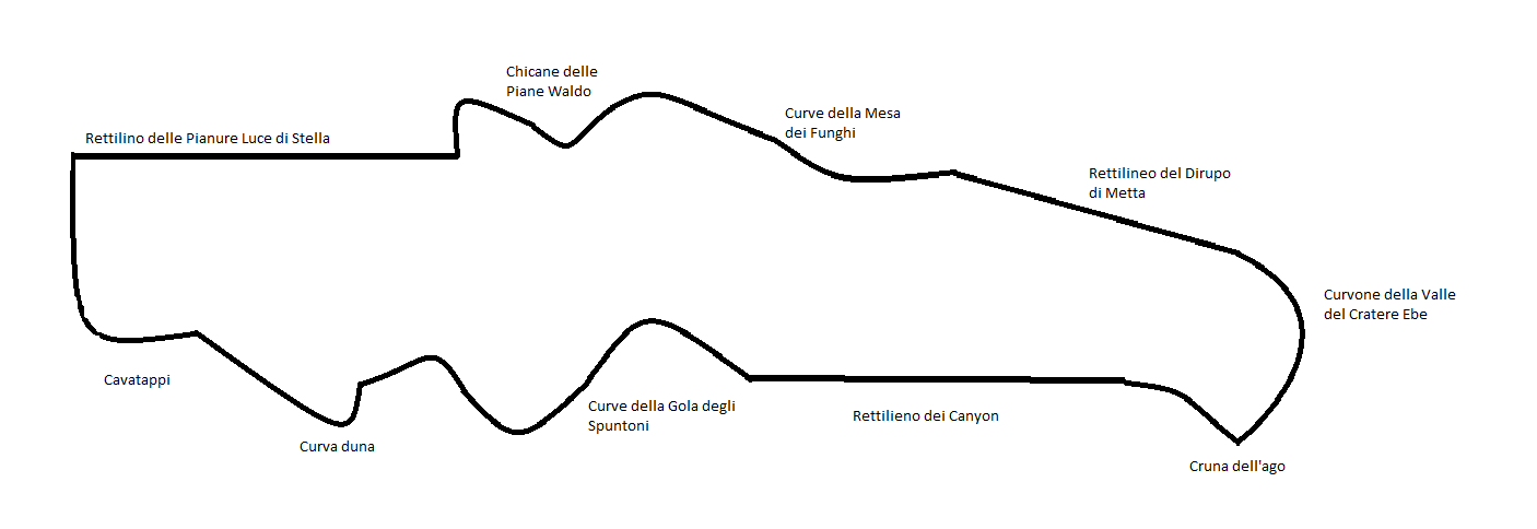 E, quindi, quale posto migliore per iniziare il VirtualGP invernale se non il circuito per sgusci di Tatooine?Il circuito prevede un lungo rettilino lungo le Pianure Luce di Stella, a seguire la strettissima chicane nel canyon attraverso le Piane Waldo. Seguono una serie di curve veloci alla Mesa dei Funghi, seguiti da un rettilineo in discesa conosciuto come il dirupo di Metta verso il curvone della Valle del Cratere Ebe. Segue una curva a gomito dove i sorpassi sono quasi impossibili (alla Ricciardo, per capirsi) conosciuta come la Cruna dell’Ago che inizia la parte di ritorno del circuito. Il circuito continua con il rettilineo dei canyon e le curve della Gola degli Spuntoni chiuse dalla temibilissima Curva Duna. Il circuito si conlude con la curva veloce del Cavatappi che riporta dritti alla linea di partenza nello stadio esultante.